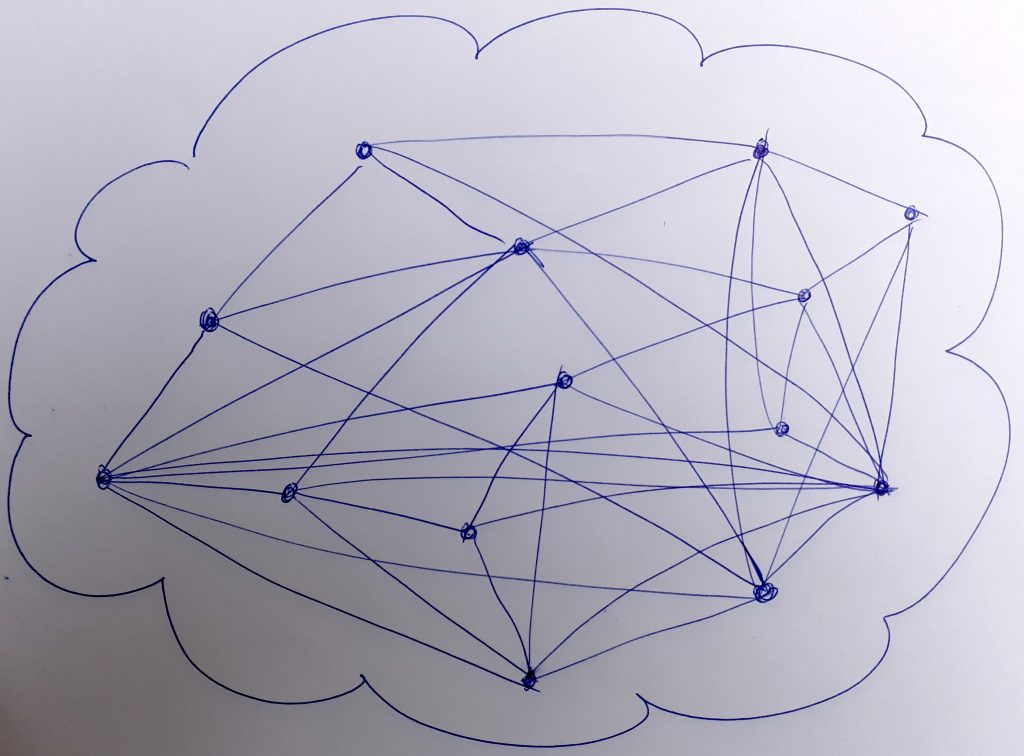 Wenn wir beispielsweise nur das Computernetzwerk auf Infrastruktur-Ebene (s.o.) betrachten, dann sehen wir ganze viele Knotenpunkte/Rechner und ein quasi undurchschaubare Anzahl an Verbindungen/Netzwerk dazwischen: